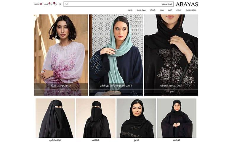 متجر الكتروني متخصص ببيع العبايات، التصميم الواضح والبسيط الذي من خلاله يتم عرض المنتجات بطريقة ملفتة للانتباه. البنرات الرئيسية في اعلى الصفحة يجعل عرض تصاميم العبايات اكثر جذبا للزوار من اجل زيادة التفاعل.